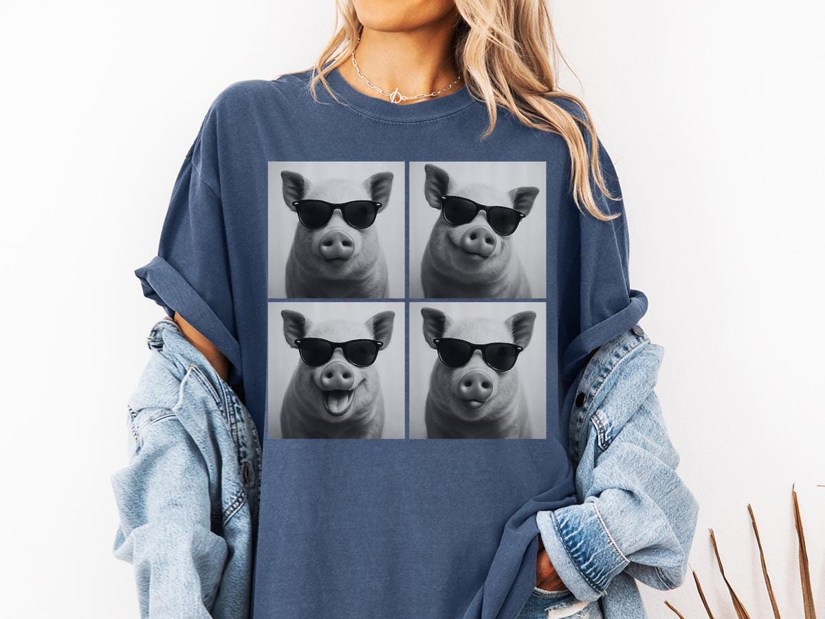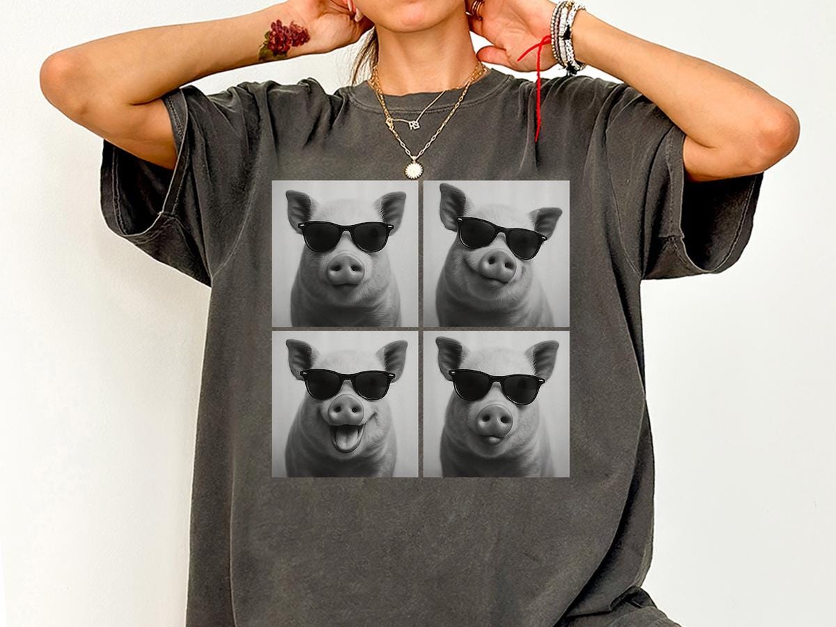 Show off your fun side with this hilarious pig sunglasses graphic tee! Featuring four playful black-and-white pig portraits each rocking a pair of cool shades, this shirt is the perfect mix of humor and style.